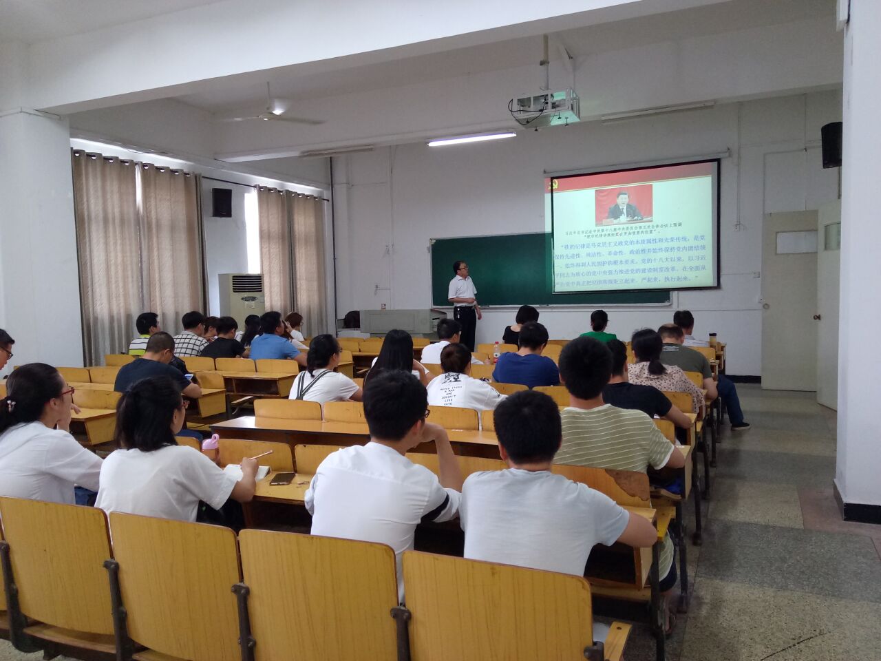 2018年6月14日下午,我院全体教职工、全体学生党员在博学楼102开展主题党日集中学习活动,总支书记夏启中同志为大家讲了题为《党员干部应严守党的纪律和规矩》的党课,并带领大家学习了5月2日习近平总书记在北大座谈会上的讲话。