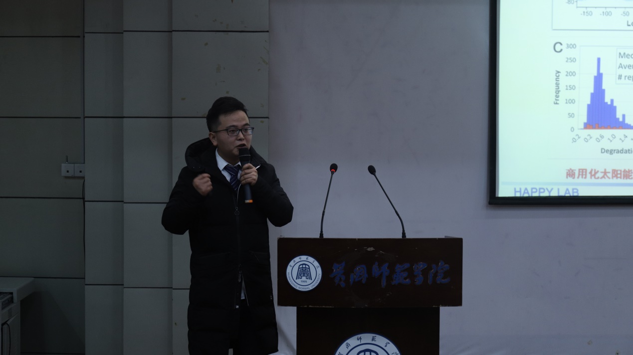 黄春保教授主持的后半段学术报告会10点10分正式开始,来自中山大学的佘志刚教授(我院化学78级),江汉大学的徐志花教授(我院化学96级),北京大学的在读博士生王立刚(我院应化10级)分别带来了《南海红树林内生真菌活性代谢产物研究》、《室温催化氧化甲醛复合材料的设计、制备和性能》、《稳定高效的铅卤钙钛矿光电器件》的学术报告,黄老师不仅介绍了各位校友的简历,还把校友们在校时的精彩人生做了回忆,各位校友也在介绍自己的成果的同时,回忆了在校时的点点滴滴,我院的师生们不时被气氛感染,发出会声的微笑。
