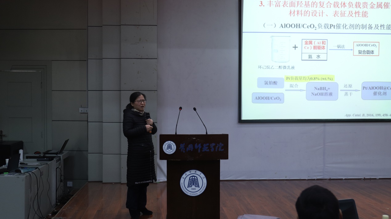 4:00,由徐志花教授主持的下半段报告正式开始,冒着风雪赶来的武汉大学董秀琴副教授、湖北大学王升富教授为在座的师生做了题为《基于非共价键活化策略发展新型手性双膦配体及其在不对称氢化反应中的应用》、《核酸适体传感器用于生物标志物检测研究》的学术报告。