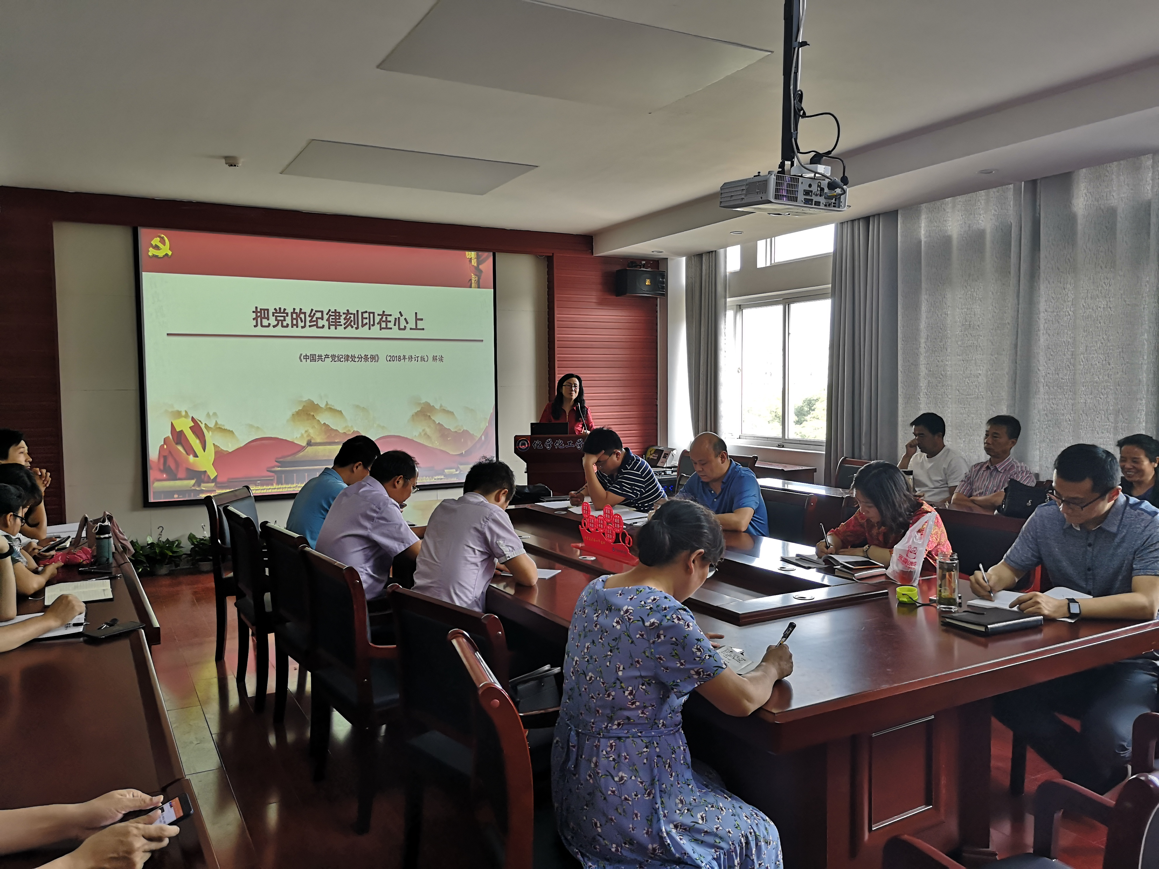 为落实第二十个党风廉政建设宣传教育月活动安排,5月27日下午4点,化学化工学院党总支书记施向荣同志在化工楼407会议室给全体教职工上了一堂题为“把党的纪律刻印在心上”的廉政党课,施向荣同志讲了《中国共产党纪律处分条例》历次制定修改情况、新《条例》有哪些特点、新《条例》中哪些硬杠杠不可触碰、把党的纪律刻印在心上四个方面的内容,整个课堂上气氛严肃,庄重。教职工听后,对《中国共产党纪律处分条例》有了进一步的认识,党员同志的廉洁意识得到进一步加强。