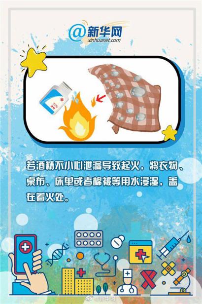 5). 应急处置。如酒精溢散,应及时擦拭处理。如酒精意外引 燃,可使用干粉灭火器、二氧化碳灭火器等进行灭火,小面积着 火也可用湿毛巾、湿衣物覆盖灭火。如酒精在室外燃烧,可以使 用沙土覆盖。