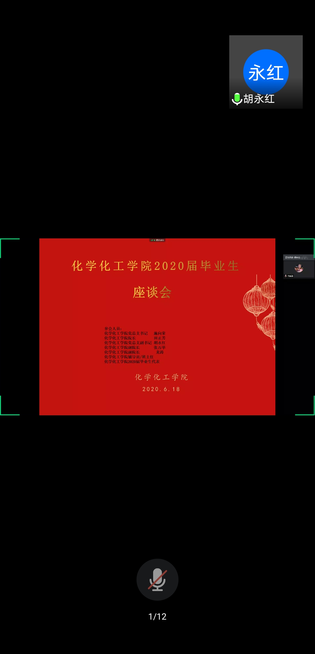 6月18日晚上7点30分,我院腾讯会议上举办了2020届毕业生空中座谈会。化学化工学院党总支书记施向荣,化学化工学院院长田正芳,化学化工学院党总支副书记胡永红,副院长龙涛、张万举,及全体辅导员与我院2020届部分毕业生代表进行了友好的会谈。