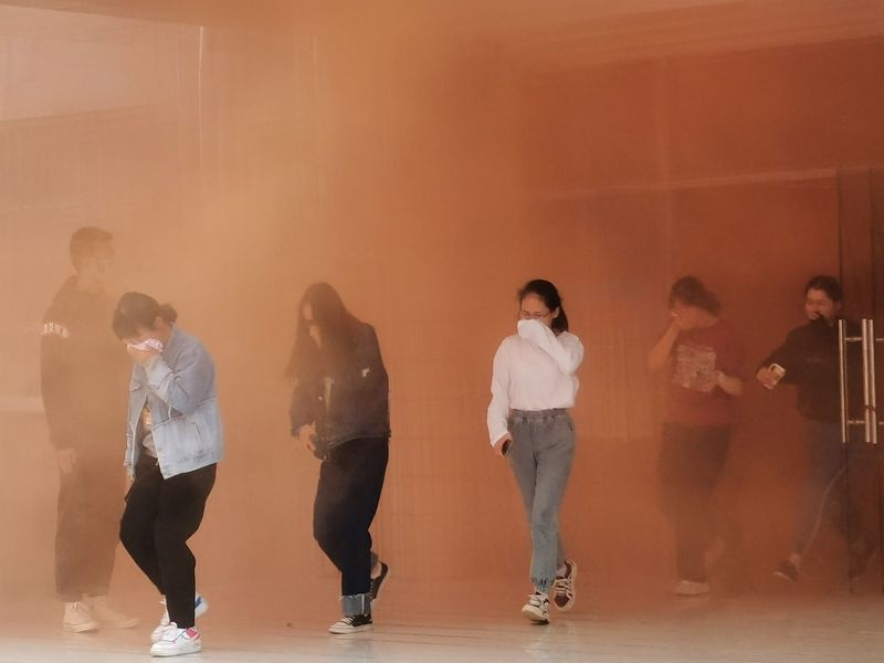 警报声响,同学们沉着冷静,用湿毛巾捂住口鼻, 听从楼内疏散人员的指令,弯腰有序地下楼, 疏散人员按照预先的消防演习方案疏散学生,保证楼内学生的安全,以免慌乱中出现拥挤或者踩伤学生现象。