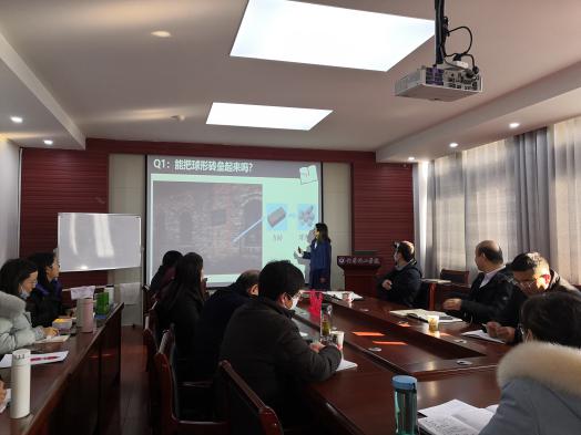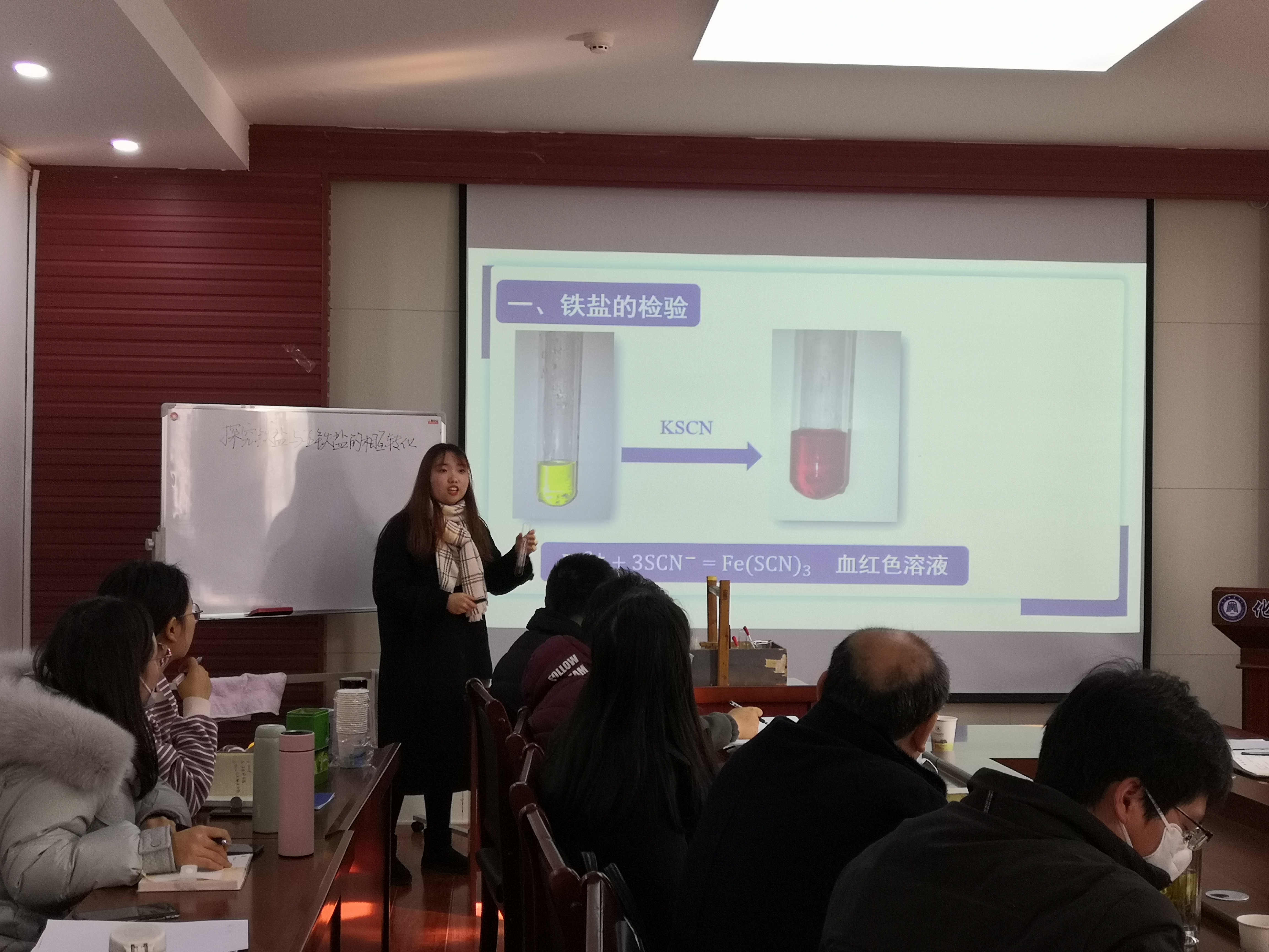 2020年12月24 日下午,化学化工学院全体教师与黄冈中学刘海英副校长及化学教研组长熊全告老师、备课组长王恩逢老师、甘文广老师和张进老师一起在407 会议室开展了“发展化学核心素养的教学研讨”活动,2018级化学师范研究生观摩了此次教研活动。龚明丽和胡青两位教育硕士分别进行了“离子键”和“铁离子的相互转换”的微课教学,两节微课分别从微观模型建构和实验探究出发,帮助学生逐步理解物质的性质与转化、微观离子之间的相互作用力,体现了以发展学科核心素养为本的教学取向。