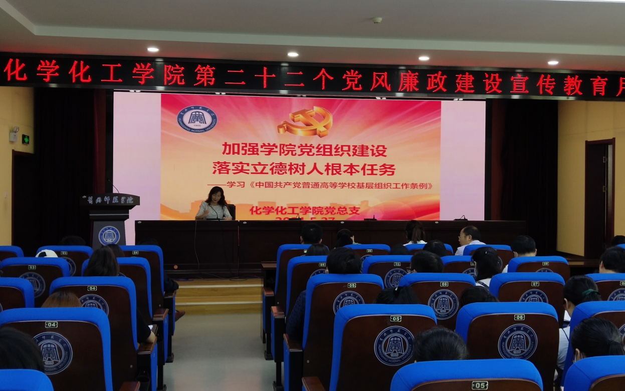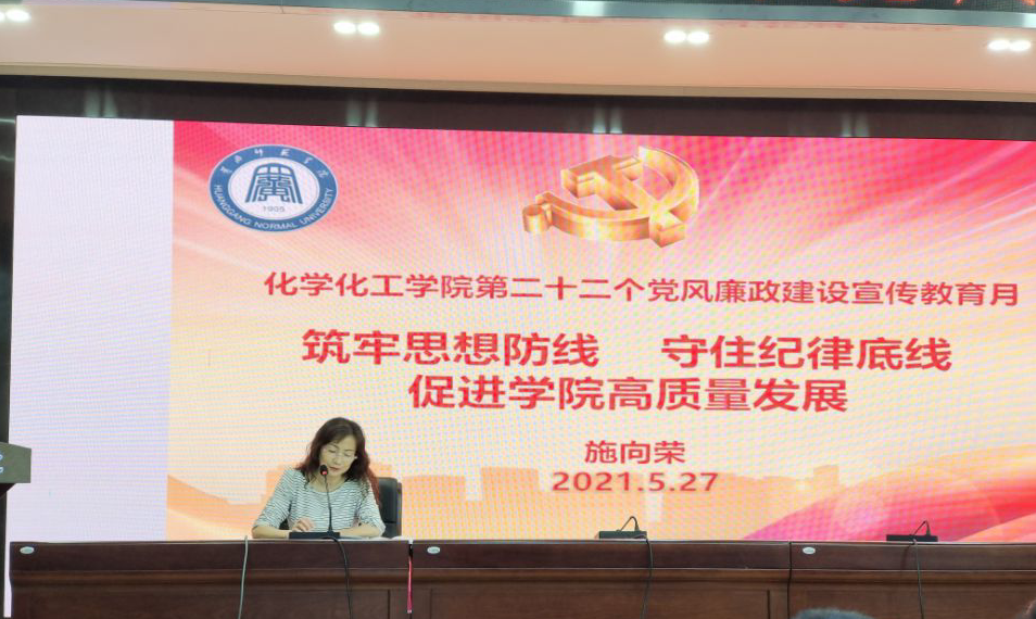 根据《化学化工学院第二十二个党风廉政建设宣传教育月活动实施方案》的具体安排,5月27日下午2:00,在致远楼三楼会议室党总支书记施向荣为化学化工学院师生讲授题为《筑牢思想防线 守住纪律底线 促进学院高质量发展》廉政党课,并就学习《中国共产党普通高等学校基层组织工作条例》作《加强学院基础党组织建设 落实立德树人根本任务》专题辅导报告。化学化工学院全体教师和学生代表参加会议。