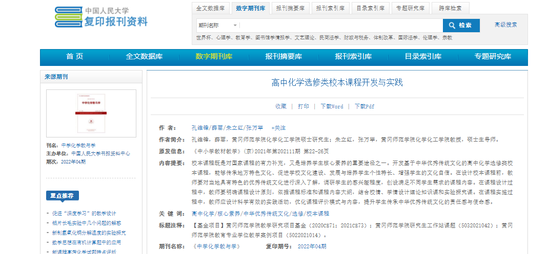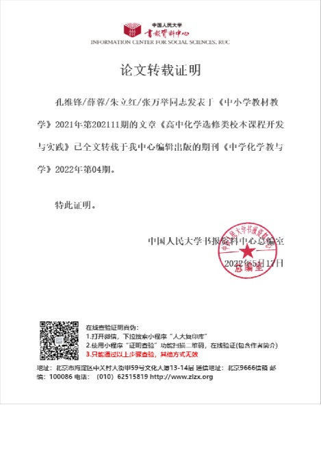 近日,从中国人民大学复印报刊资料数据库获悉,我校学科教学(化学)领域研究生孔维锋(指导教师张万举、朱立红教授)撰写的论文《高中化学选修类校本课程开发与实践》(原载《中小学教材教学》2021年第11期)被中国人民大学书报资料中心复印报刊资料《中学化学教与学》2022年第4期全文转载。