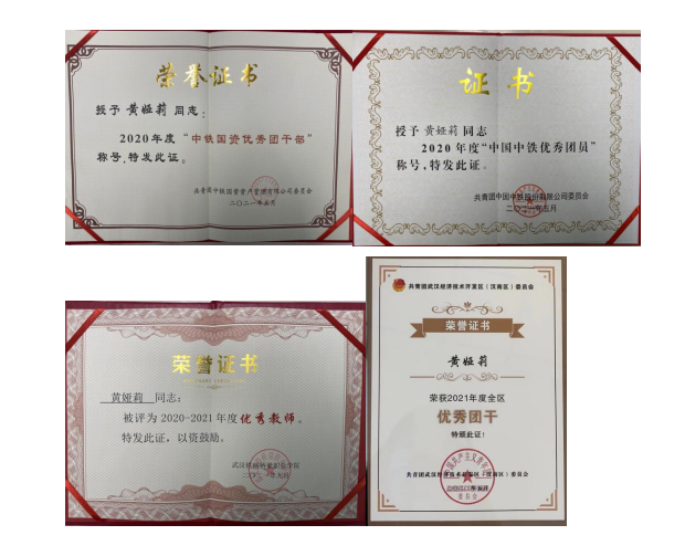 黄娅莉担任19级铁运4班班主任,班级学风良好,团结友爱。2019-2020学年度国家励志奖学金获得者5名。2021年4月获党史知识竞赛三等奖。2019年12月获“一二•九”爱国学生运动歌唱比赛三等奖。该同志积极组织班级开展了学习榜样表彰大会、文艺汇演、班干部述职大会、求职能力大赛等各项课余活动。