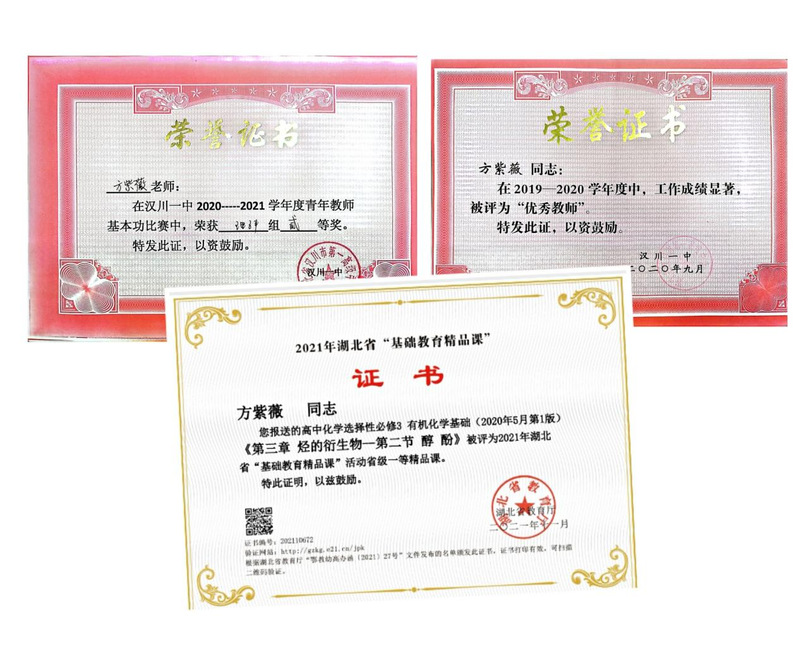 2020年9月,她被评为汉川一中优秀教师,2021年6月,在青年教师基本功大赛中获理科组二等奖,2021年11月,《第三章 烃的衍生物——第二节 醇 酚》被评为2021年湖北省“基础教育精品课”活动省级一等精品课。