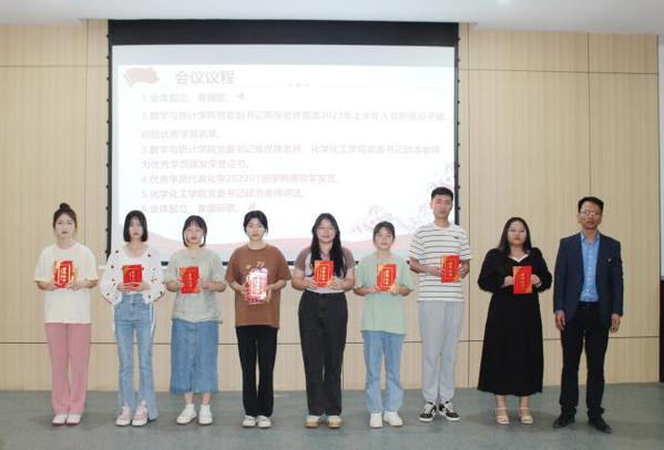 为认真贯彻落实党员发展细则,扎实入党积极分子的党史教育基本功,提高入党积极分子的基本素养。数学与统计学院、化学化工学院于4月17日晚19:00在博学楼B01举行了2023年上半年入党积极分子培训班结业典礼,顺利完成所有培训内容。本次入党积极分子培训班结业典礼由化学化工学院党委副书记龙刚主持,数学与统计学院党委书记陈世辉、党委副书记陈琛、学生第一党支部书记杜雯、化学化工学院党委书记邱浩、学生第一党支部书记余杨出席此次活动。