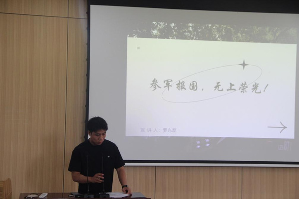 活动项,宣讲员罗光磊介绍大学生应征入伍政策。全面解读了国家、我省及学校关于入伍大学生的政策福利,详细阐述了国防建设对于国家的重要意义,讲解了应征入伍的条件以及应征入伍的报名流程,鼓舞并动员我院在校大学生积极报名参军入伍。他期待有更多的同学能够将自己的爱国情怀化为报国之心,与时代同呼吸,与祖国共命运