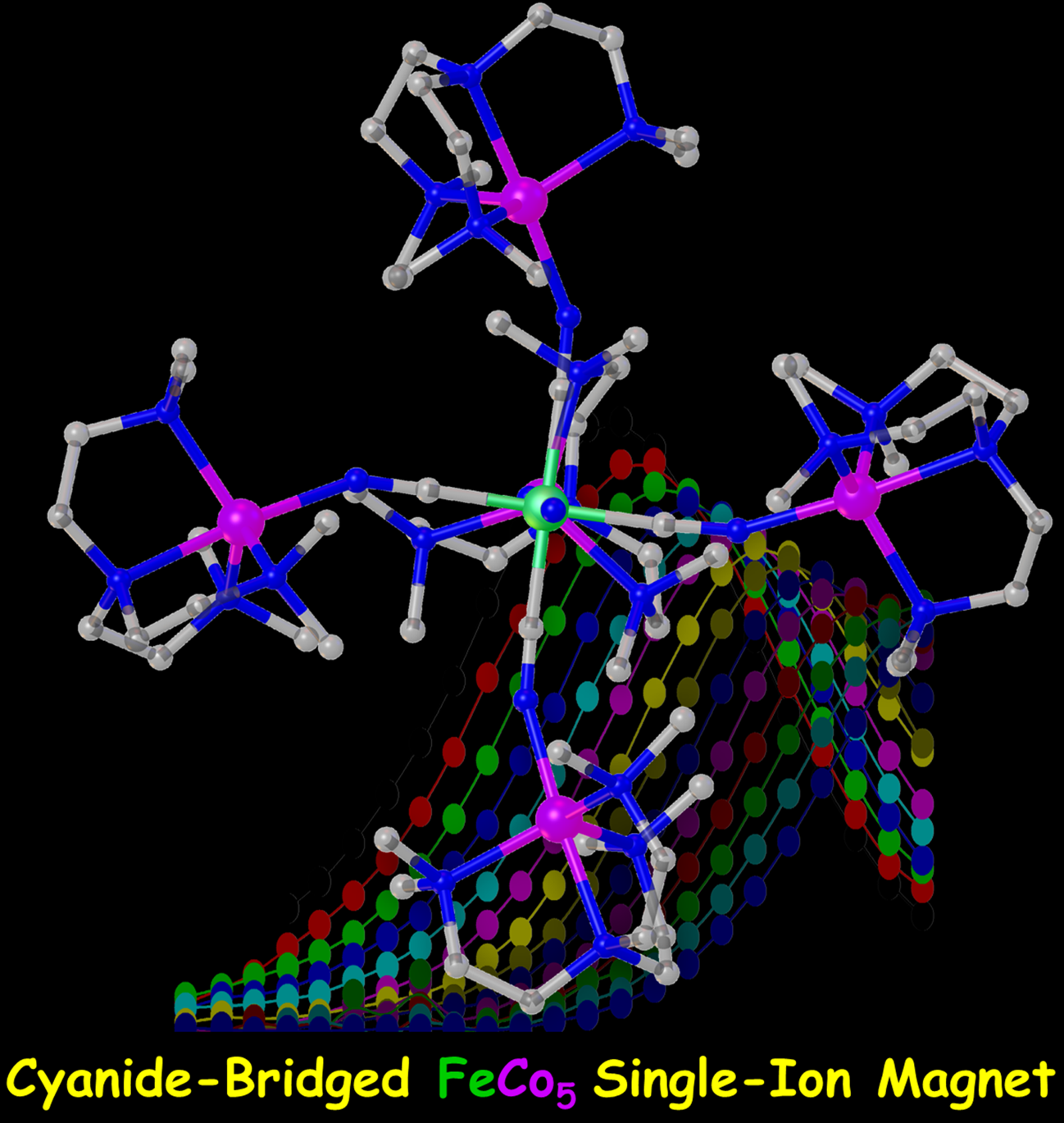 对于单分子磁体而言,多核过渡金属团簇化合物仍然是迄今为止报道的最大的单分子磁体类别。单金属中心的单离子磁体报道已经很多,但基于具有新颖结构的各向异性过渡金属离子的团簇分子体系仍然引起了极大的兴趣。然而,设计和构建这样的多核单离子磁体配合物非常困难。基于此,团队通过利用抗磁的二价铁氰根构筑单元与单核钴配合物前驱体反应,合成了一例具有四方锥结构的FeCo5六核团簇,单晶衍射分析和磁性测量表明该化合物为第一例六核的单离子磁体。该工作以 “A Cyanide-Bridged FeCo5 Square-Pyramidal Single-Ion Magnet”为题,发表在Crystal Growth Design。邵东副教授为论文第一作者,英国365集团官网为论文第一通讯单位。南京大学王新益教授和印度理工学院Singh教授参与了本工作的研究。