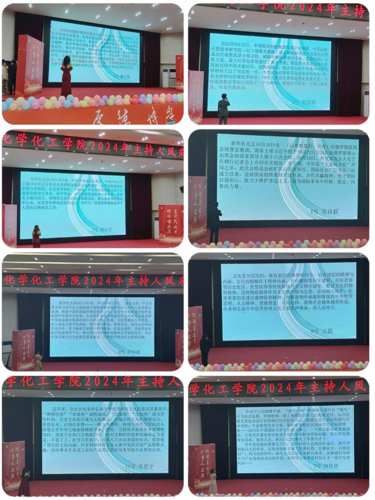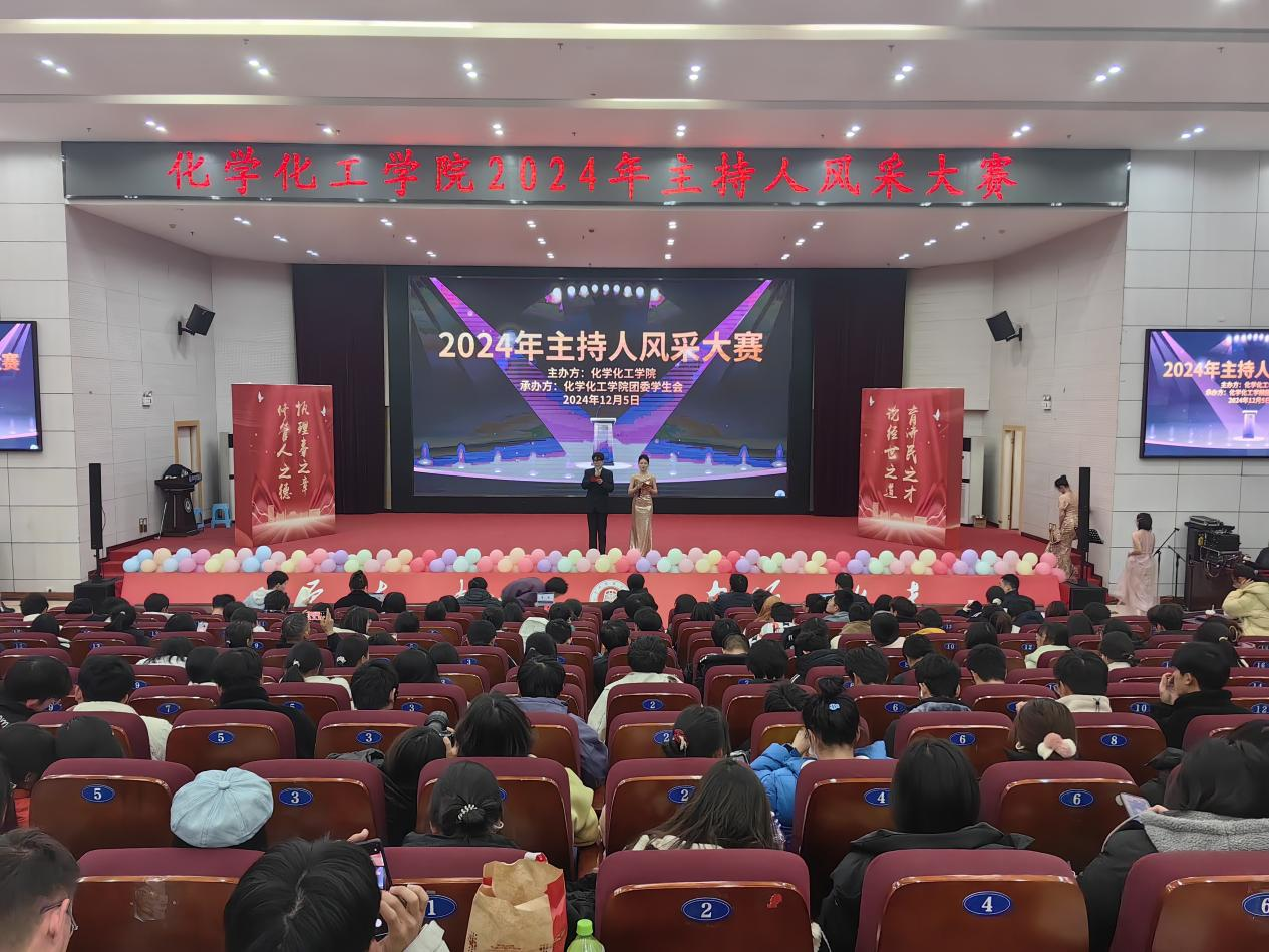202412月5日,化学化工学院在南区厚德楼学术交流中心举办“秀我新声,展我风采;青春携手,四海同音”主持人风采大赛。传媒与影视学院播音与主持艺术系副主任周萍萍生物与农业资源学院党委副书记李燕化学化工学院党委副书记龙刚、副院长龙涛、校学工部综合办事处刘政浩以及校主持队谢嘉诚、吴怡璇出席比赛并担任评委。全体大一、大二学生参加本次活动。