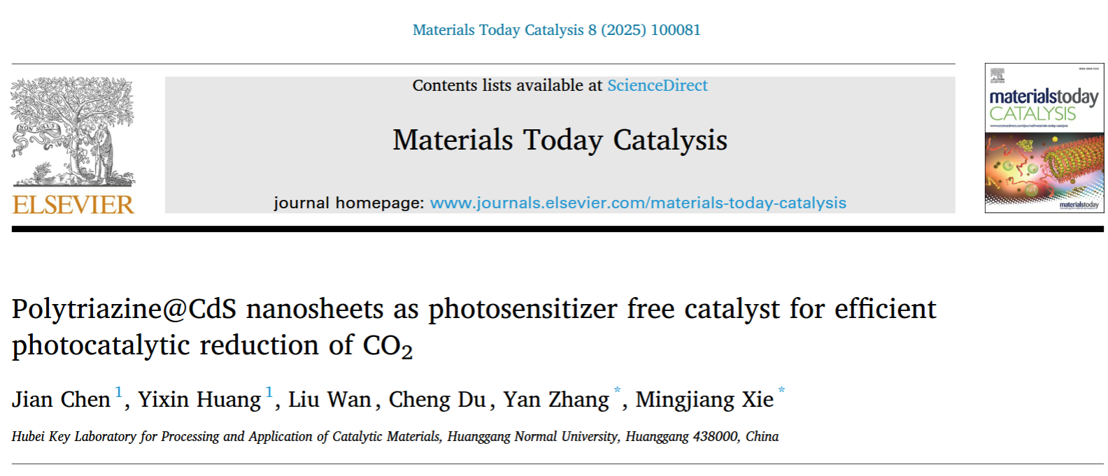 2024年12月10日,材料类国际顶级期刊Materials Today旗下新刊《Materials Today Catalysis》在线报道了我院炭基能源催化材料团队的最新研究成果“Polytriazine@CdS nanosheets as photosensitizer free catalyst for efffcient photocatalytic reduction of CO2”,陈建副教授和本科生黄怡昕为改论文的共同第一作者,张燕博士和解明江教授为论文共同通讯作者,团队的其他老师参与了本工作的研究,英国365集团官网为论文第一通讯单位。
