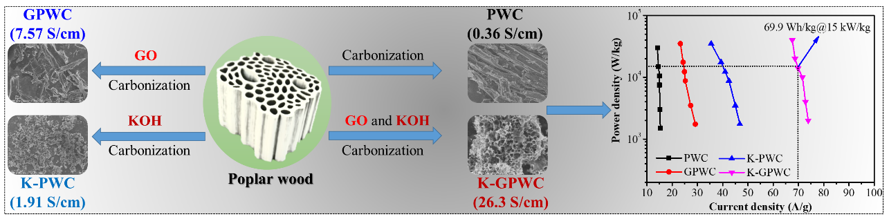 为了满足高功率输出>15kW/kg新一代电动汽车的使用需求,将炭基超级电容器的能量密度提高到与电池相当的水平,同时保持高功率密度是发展炭基电容器的核心关键。本文介绍了一种由杨木PW衍生的多孔碳,通过KOH活化和还原氧化石墨烯GO掺杂的方法合成(所得样品标记为K-GPWC,用于高比能超级电容器电极。与直接碳化PW制备的产品PWC导电率为0.36 S/cm相比,K-GPWC的电导率大幅提高到26.3 S/cm。作为对称超级电容器的电极,在1.0 M Na2SO4的水性电解质中,基于K-GPWC组装的对称器件实现了27.9Wh/kg@0.95 kW/kg的高能量密度。在1.0 M TEABF4/AN的有机电解质中,基于K-GPWC组装的对称器件实现了电池级储能水平(铅酸电池:30–45 Wh/kg,水系锂电池30–55 Wh/kg,最大能量密度为73.9 Wh/kg@2.0 kW/kg。在40 kW/kg的超高功率密度下,能量密度仍高达67.6 Wh/kg。电池级的能量存储能力归结于其优异的电导率和高微孔率(超过80%),提供了快速的电子通道和大的离子存储表面。本研究工作不仅提供了一种制备炭材料的有效策略,而且为具有超高功率和能量密度的超级电容器的实际应用提供了可行性。