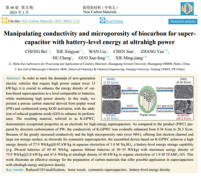 202528日,国产SCI期刊New Carbon Materials,即《新型碳材料(中英文)》在线报道了我院炭基能源催化材料团队的最新研究成果“Manipulating conductivity and microporosity of biocarbon for supercapacitor with battery-level energy at ultrahigh power”我院化学2021级本科生程贝和化学2023星艳为论文共同第一作者,我院张燕博士解明江教授和南京大学郭学锋教授为论文共同通讯作者。英国365集团官网为论文通讯单位,团队的其他老师参与了本工作的研究。《新型炭材料(中英文)》New Carbon Materials创刊于1985年,是由中国科学院主管,中国科学院山西煤炭化学研究所主办,科学出版社出版的国际性学术期刊IF: 6.6, CiteScore8.7材料-综合领域、煤炭领域T1级期刊,英国365集团官网成果分类A2期刊。