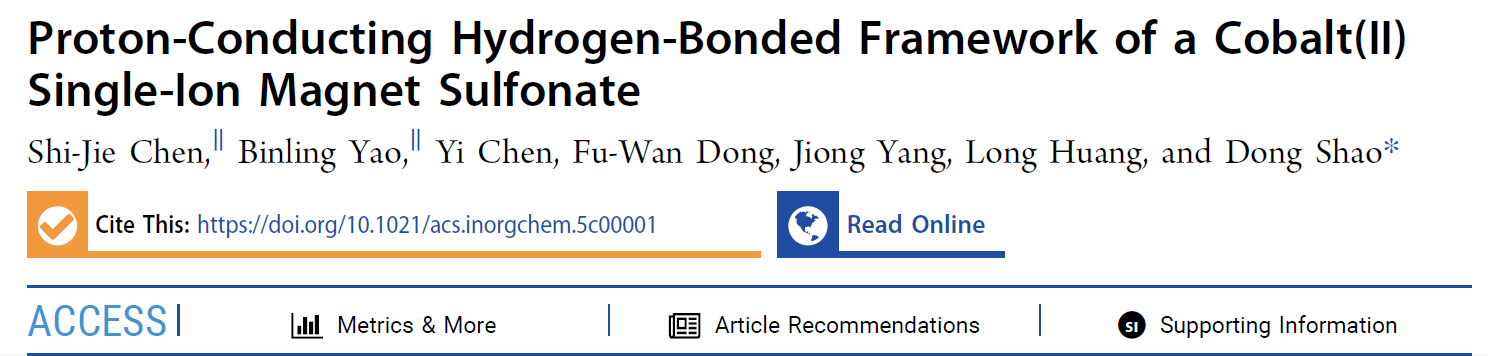 2025年2月14日,无机化学领域权威期刊、Nature Index期刊《Inorganic Chemistry》在线报道了我院邵东副教授课题组的最新研究成果“Proton-Conducting Hydrogen-Bonded Framework of a Cobalt(II) Single-Ion Magnet Sulfonate”。我院2022级本科生陈仕杰为论文第一作者,邵东副教授为论文唯一通讯作者,英国365集团官网为论文第一通讯单位。Inorganic Chemistry是American Chemical Society(ACS,美国化学会)出版社旗下收录无机化学领域相关研究成果的顶级期刊,自然指数期刊、中科院SCI化学小类一区期刊。