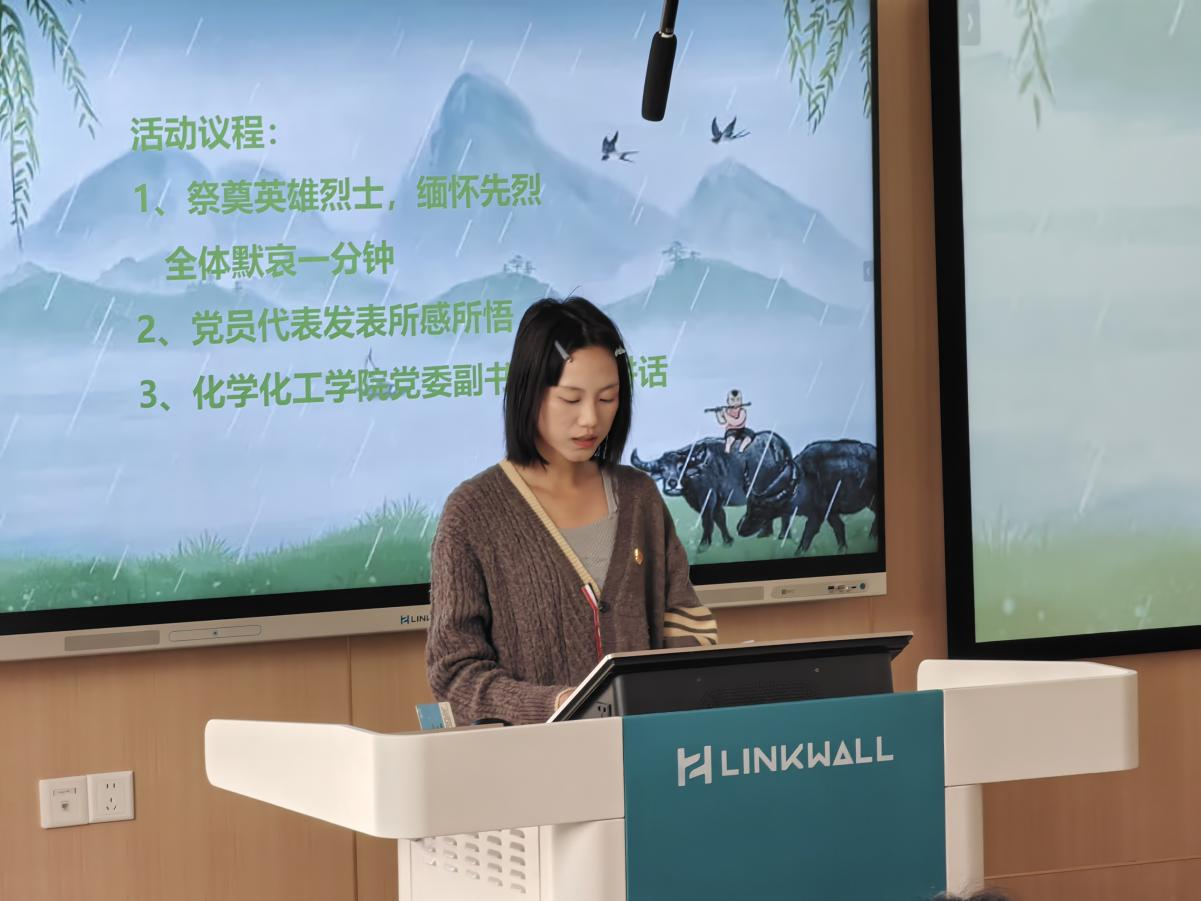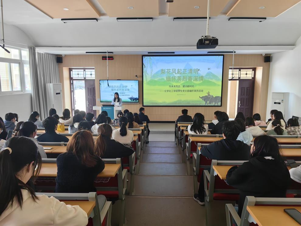 四月的校园,松柏凝翠,又一年清明悄然而至。为加强学生党员理想信念教育和爱国主义教育,铭记革命先烈的英勇事迹。4月1日中午,化学化工学院在博学楼B01教室举行清明节祭英烈活动。院党委副书记龙刚、全体辅导员老师以及全体学生党员参加活动。本次活动由学生党员王羽琪主持。